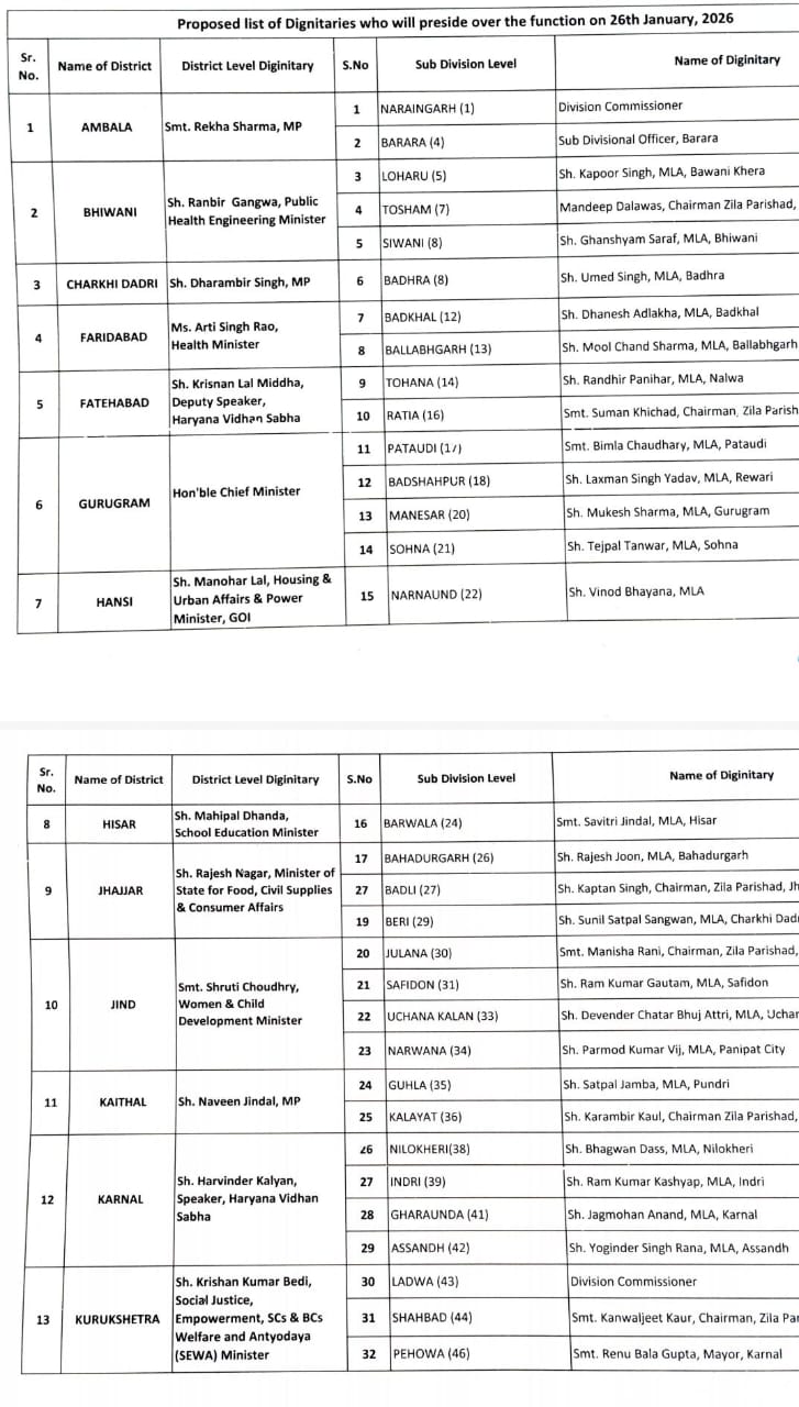 Haryana Flag Hoisting List : इस बार गणतंत्र दिवस के उपलक्ष्य में 26 जनवरी 2026 को होने वाले समारोह में ध्वजारोहण करने वाले मुख्य अतिथि तय कर दिए गए हैं। प्रदेश के राज्यपाल असीम घोष पंचकूला में ध्वजारोहण करेंगे। एटहोम राजभवन में होगा। सीएम नायब सिंह सैनी गुरुग्राम में होने वाले समारोह में शिरकत करते हुए ध्वजारोहण करेंगे। जींद में महिला एवं बाल विकास मंत्री श्रुति चौधरी ध्वजारोहण करेगी। वहीं जींद के विधायक और डिप्टी स्पीकर डॉ. कृष्ण मिढ़ा फतेहाबाद में ध्वजारोहण करेंगे।