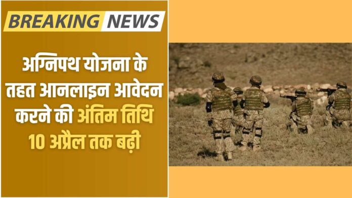 Agnipath Scheme : अग्निपथ योजना के तहत आनलाइन आवेदन करने की अंतिम तिथि को बढ़ाकर 10 अप्रैल कर दिया गया है। जिला जींद के युवाओं के साथ-साथ जिला हिसार, हांसी, सिरसा व फतेहाबाद के युवा भर्ती के लिए वेबसाइट डब्ल्यू डब्ल्यू डाट ज्वाइन इंडियन आर्मी डाट एनआइसी डाट इन पर पंजीकरण कर आवेदन कर सकते हैं। भर्ती निर्देशक, सेना भर्ती कार्यालय हिसार ने बताया कि इच्छुक उम्मीदवार उनकी योग्यता के अनुसार दो अग्निवीर श्रेणी के लिए आवेदन करने का विकल्प इस वर्ष भी दिया गया है।