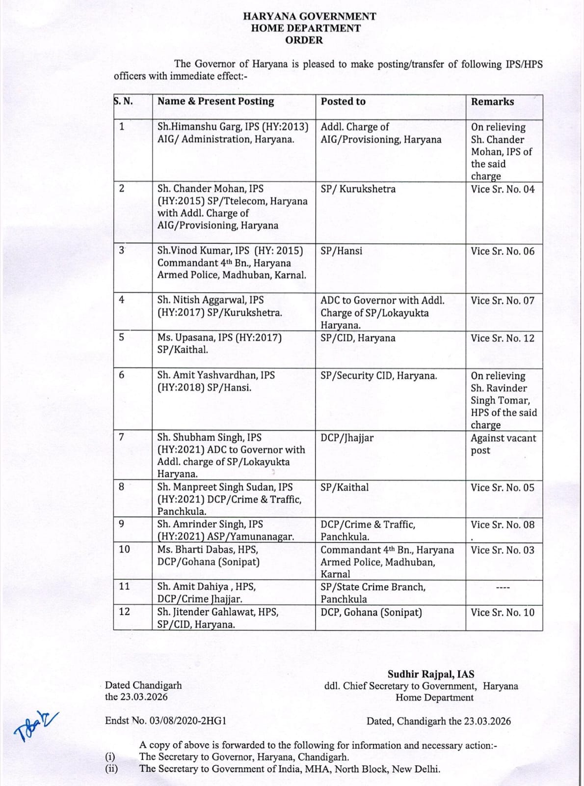 Haryana IPS Transfer list 2026 : हरियाणा में पुलिस विभाग में बड़ा फेरबदल हुआ है। कुछ दिन पहले आईएएस और आईपीएस अधिकारियों की ट्रांसफर लिस्ट आई थी। अब फिर से एक और ट्रांसफर लिस्ट आई है, जिसमें 9 आईपीएस और 14 एचपीएस अफसरों के ट्रांसफर किए गए हैं। राज्य सभा चुनावों के बाद से सरकार द्वारा अफसरसाही में तीसरी ट्रांसफर लिस्ट जारी की गई है।