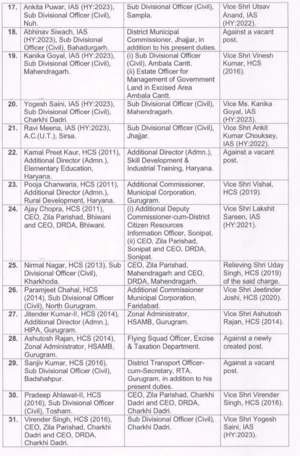 सरकार द्वारा जारी आईएएस व एचसीएस की ट्रांसफर लिस्ट में गीता भारती को हिसार मंडल का कमिश्नर, रवि प्रकाश गुप्ता को गुरुग्राम मंडल का कमिश्नर नियुक्त किया गया है। IAS अमित अग्रवाल को केडीबी की जिम्मेदारी दे दी गई है। IAS सत्येंद्र दुहान स्किल डेवलपमेंट एंड इंडस्ट्रियल ट्रेनिंग सेंटर के डॉयरेक्टर बने हैं। नवनियुक्त IAS अंकित कुमार चौकसे को पानीपत में ADC और उत्सव आनंद को हिसार में ADC बनाया गया है।